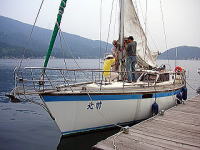 10:45AM、ファーストハーバー敦賀を出航しました。停滞前線が日本海上にあり、福井県嶺南地方に大雨注意報が発令、日本海は梅雨に戻ったような気圧配置。 9時過ぎにハーバーに到着し、艇をポンツーンに着け、荷物を車から運び出したところで雨。雷がとどろき、バケツをひっくり返したような大雨、雷雲が通り過ぎるまで作業中断、荷物がかなりぬれてしまった。昨夜買ったおいしそうなフランスパンはもう駄目かな?雨が落ち着き、荷物を積み込み、とりあえず出航。出航メンバーは、西之園、信田、大西の3名。青木は昨日受けた船検の書類を受け取りに舞鶴へ(ぎりぎりの船検取得でした)。明日から、本田と乗り込みます。 途中、西風の強風に煽られ、向かい風を機走で走行、夕刻17時過ぎに小浜港に入港しました。 |